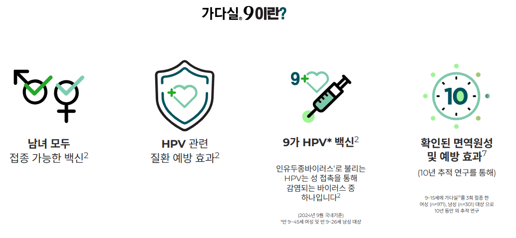 | 가다실 4가, 9가 | 만 9세 ~ 26세 | 최적의 예방 효과, 특히 11~12세 추천 |