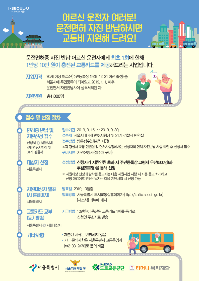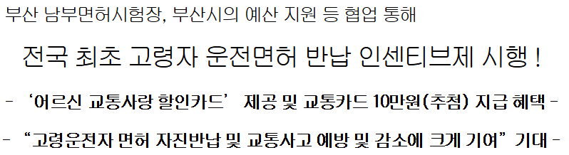 | 부산광역시 | 교통비 지원금 10만 원, 고령운전자 교육 | 교육 수료 후 지급 |