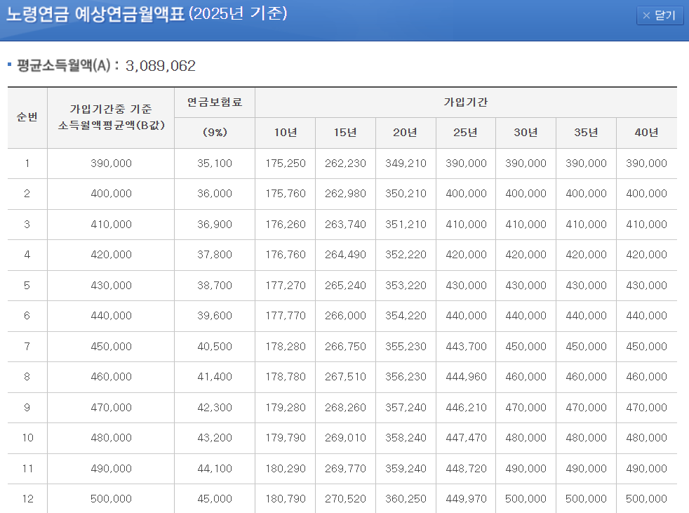 | 납부기간 | 평균소득월액 | 예상 수령액(월) |