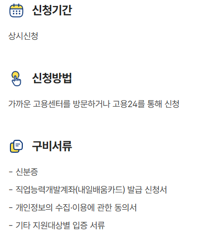 신청은 온라인(HRD-Net) 또는 **오프라인(고용센터 방문)**으로 가능합니다. 최근에는 온라인 신청이 간편하고 빠르게 처리되어 선호되고 있습니다.
