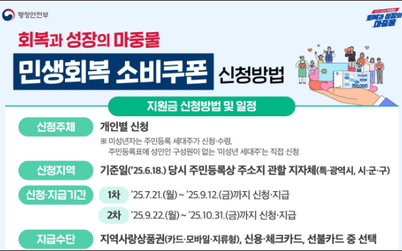 2025년 7월 21일부터 전국 지자체에서 민생회복 소비쿠폰 신청 접수가 시작되었습니다.