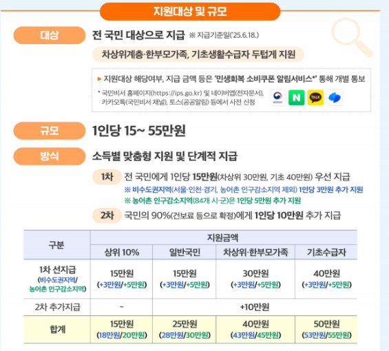 소득과 거주지 기준에 따라 1인 최대 55만 원 상당의 소비쿠폰을 지급합니다.