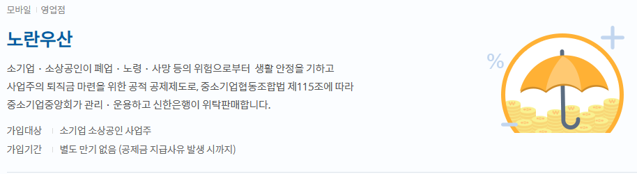 - 신한은행을 통해 노란우산공제 가입(전국 신한은행 지점 방문 또는 신한SOL앱 → 노란우산 메뉴 이용)