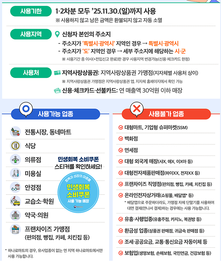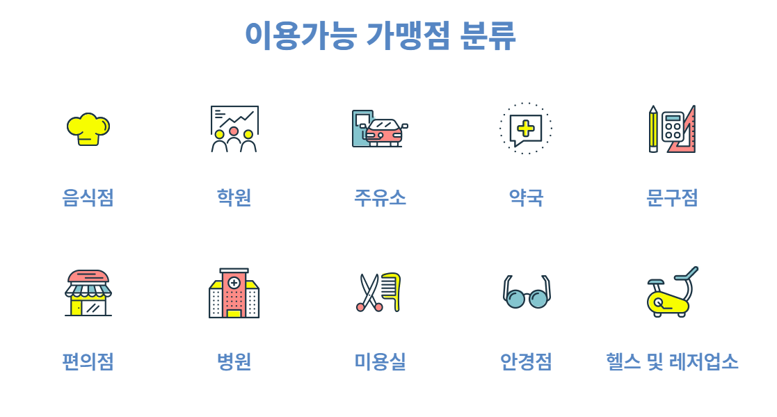 - ❌ 백화점, 대형마트, 유흥업소, 온라인 쇼핑몰 등은 사용 불가