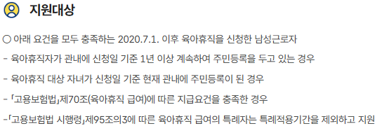 | 고용보험 요건 | 고용보험법 제70조에 따라 육아휴직 급여 수급 대상자 |