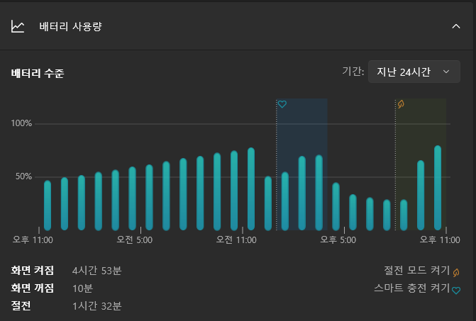 • 윈도우 전원 설정 화면에서 ‘스마트 충전이 설정되어 있습니다’ 문구가 사라진 것을 확인할 수 있음