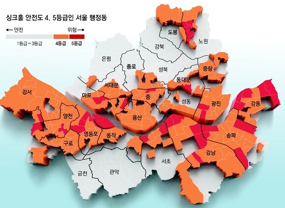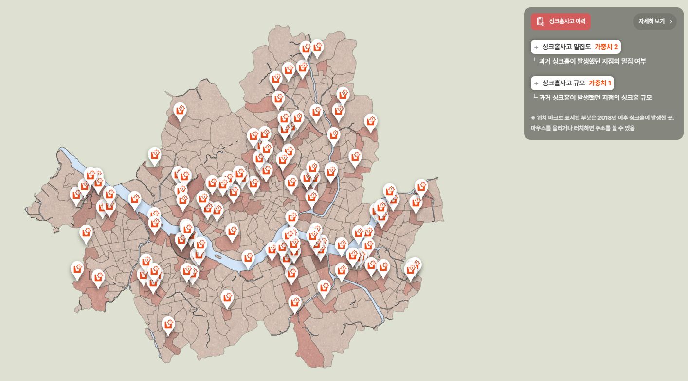 서울시는 시민의 안전을 위해 2015년부터 지반침하(싱크홀) 위험지역 정보를 시각화해 공개하고 있습니다.