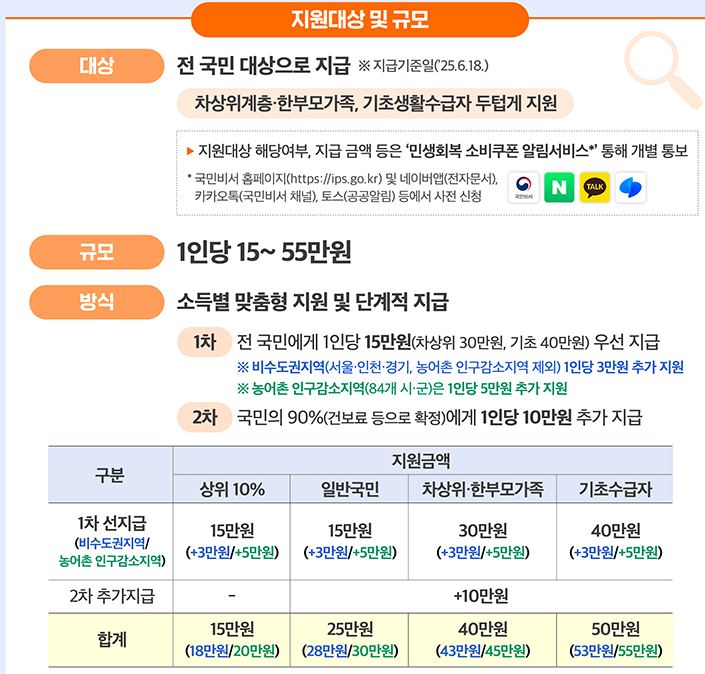 - 1차 지급: 15만 원 (2025년 7월 21일~9월 12일)