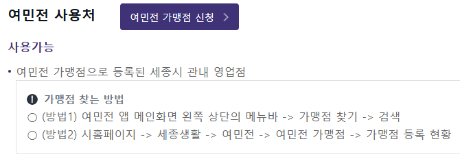 여민전은 세종시 전역의 지역 가맹점에서 사용 가능합니다.