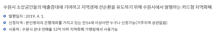 모바일 또는 실물카드 형태로 발급되어 수원시 소상공인 가맹점에서 사용 가능한 전용 화폐입니다.