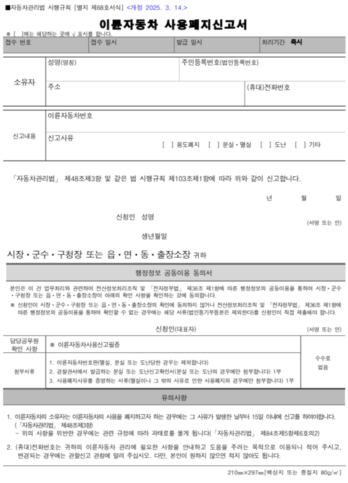 • 번호판 반납 후 15일 이내에 사용폐지 신고를 해야 합니다.