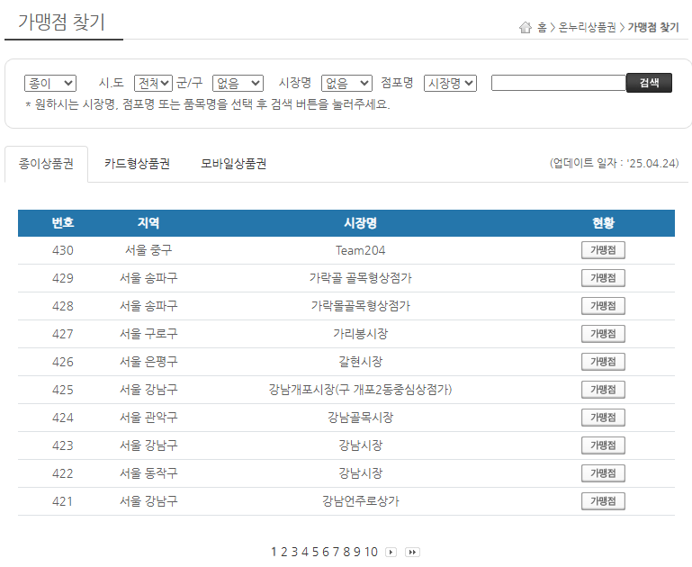 - 전국 1,500여 개 시장의 가맹점 검색 가능
