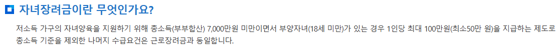- 예외 사항: 자녀가 중증장애인인 경우, 연령 제한 없이 자녀장려금 신청이 가능합니다. 단, 중증장애인 등록이 되어 있어야 하며, 자녀의 연간 소득금액이 100만 원 이하이어야 합니다