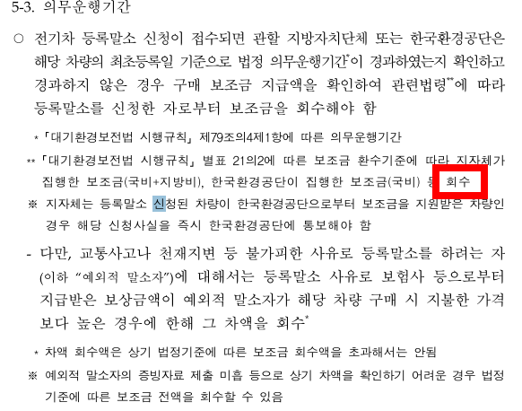 • 조기 폐차 또는 수출: 의무운행기간 내에 차량을 폐차하거나 수출하는 경우 환수 대상이 될 수 있습니다.