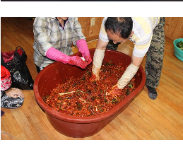 - 찹쌀풀에 고춧가루, 멸치액젓, 새우젓, 다진 마늘·생강, 설탕, 갈은 양파·배를 넣고 고루 섞기