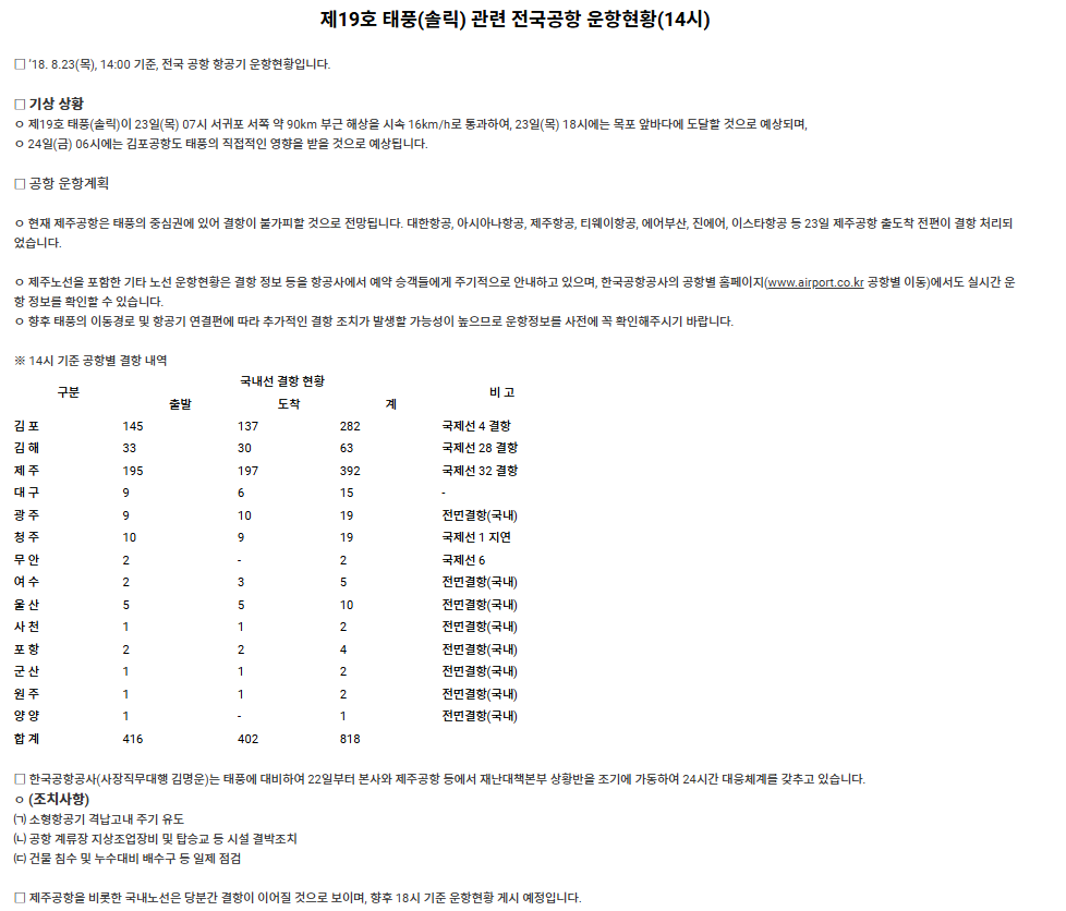 예시: 제19호 태풍(솔릭) 관련 전국공항 운영현황