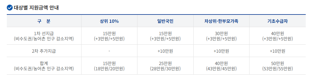 ※ 제주도는 인구소멸지역 해당 → 1차 지급 시 5만 원 추가 지원