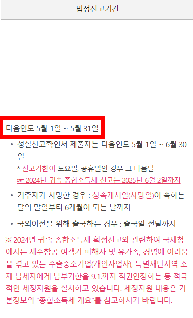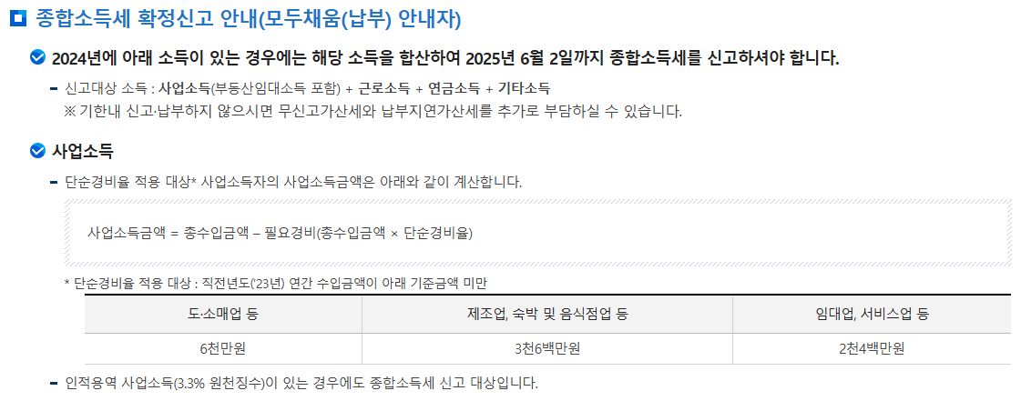 | 신고대상 소득 | 2024년 1월 1일 ~ 12월 31일까지 발생한 종합소득 |