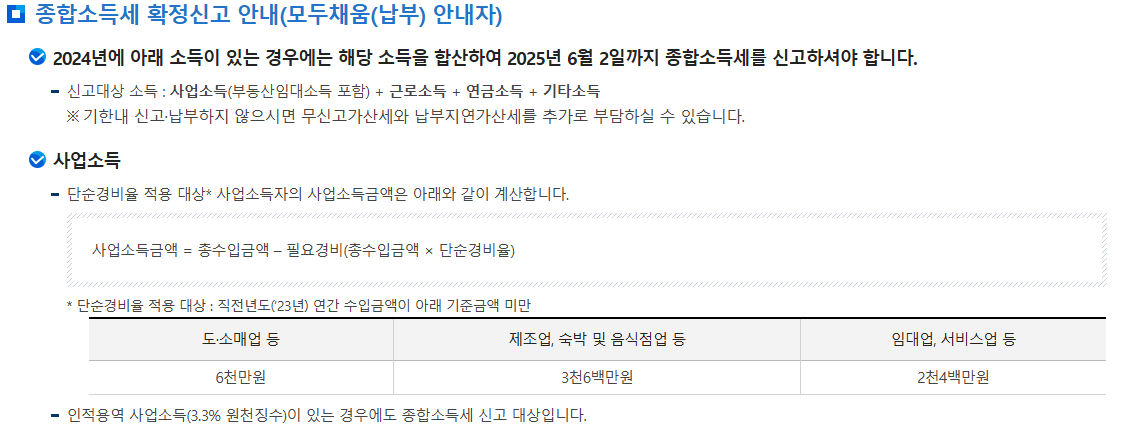 매년 5월 1일부터 5월 31일까지 전년도(2024년)의 소득을 기준으로 국세청에 자진신고해야 합니다.