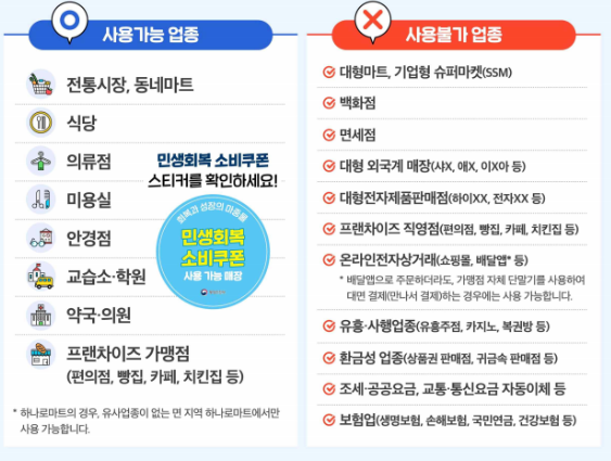 | 음식점, 카페, 병원, 전통시장, 약국, 학원 등 | 대형마트, 백화점, 유흥업소, 온라인 쇼핑몰 등 |