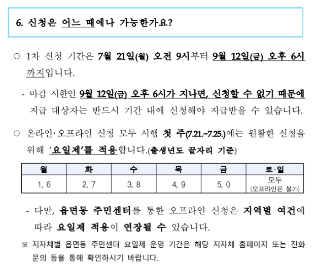 - 신청 첫 주(7/21~7/25)는 출생연도 끝자리 기준 요일제 운영