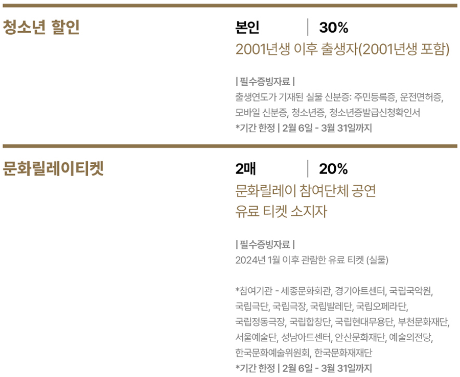 ※ 할인: 조기예매(~5/1) 10%, 청소년 20%, 장애인/국가유공자 50%
