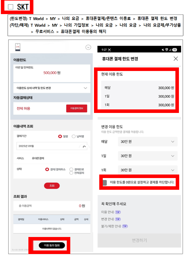 SKT ☎ 080-816-2000 상담원 연결 → “소액결제 원천차단” 요청