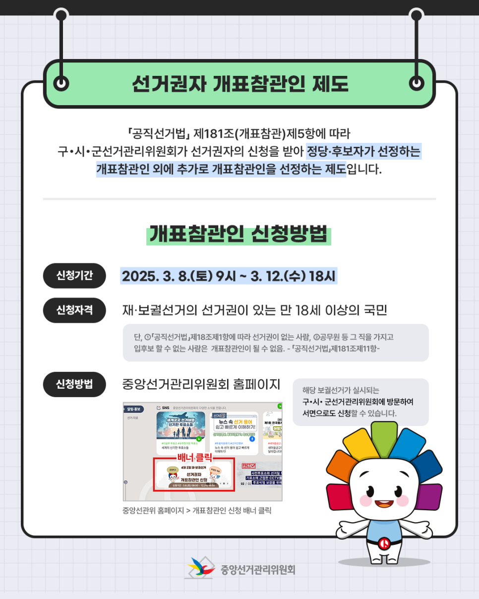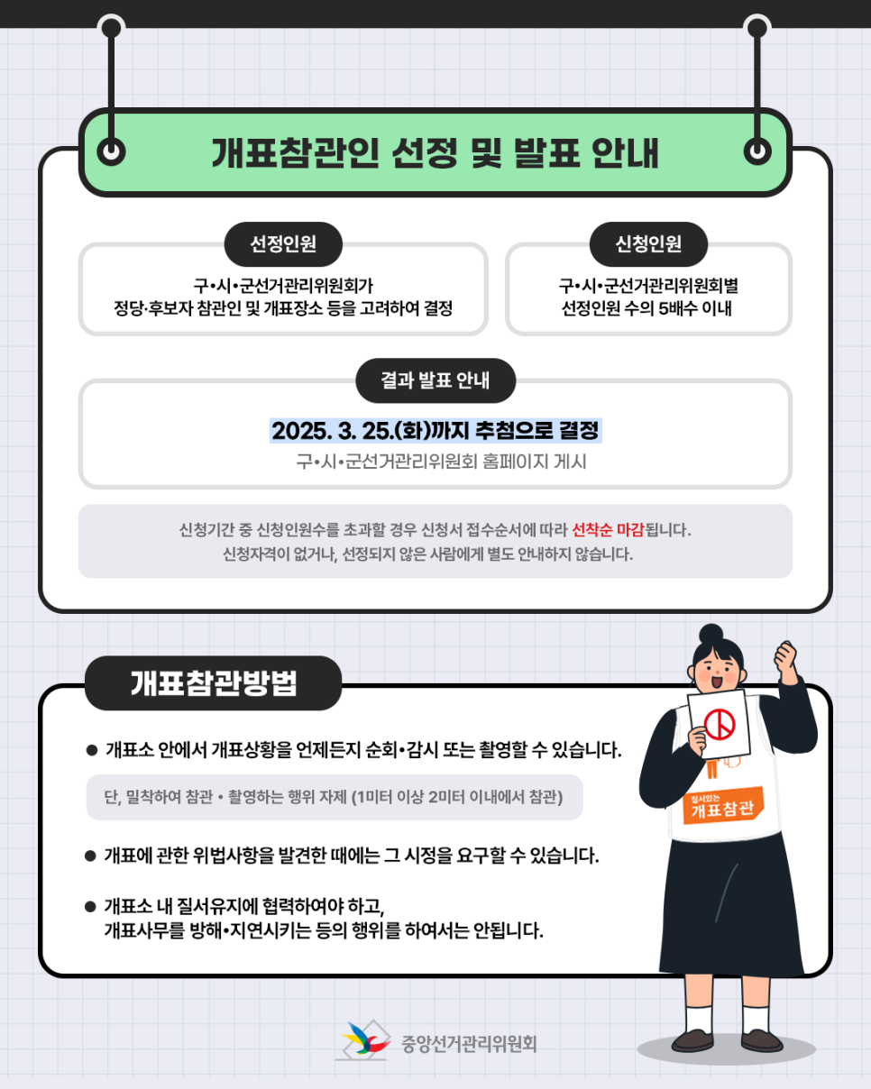 2025년 대선 개표참관인 신청은 조기 마감될 수 있으니, 관할 선관위 공고를 꼭 확인한 후 빠르게 신청해보세요.
