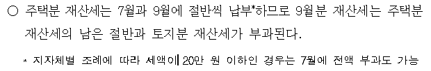 - 재산세 본세가 20만 원 이하 → 7월에 전액 납부