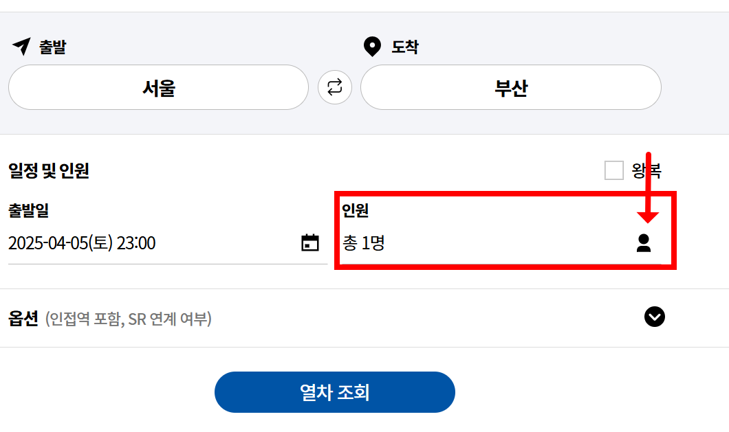 - 예매 화면에서 인원 항목을 클릭한 후, ‘경로’(65세 이상) 인원을 정확히 선택합니다.