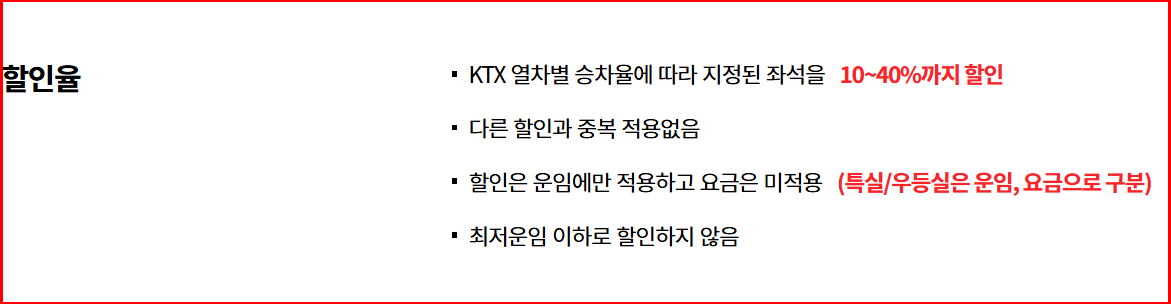 - 할인율: 열차 승차율에 따라 10% ~ 40% 차등 할인
