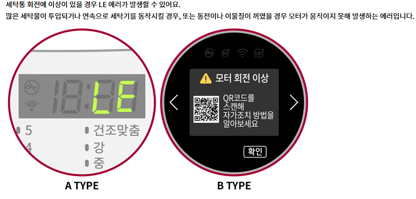 LE 에러코드는 단순히 "고장"이라고 보기보다는, 세탁기 모터가 스스로 이상을 감지하고 멈췄다는 보호신호라고 할 수 있습니다.