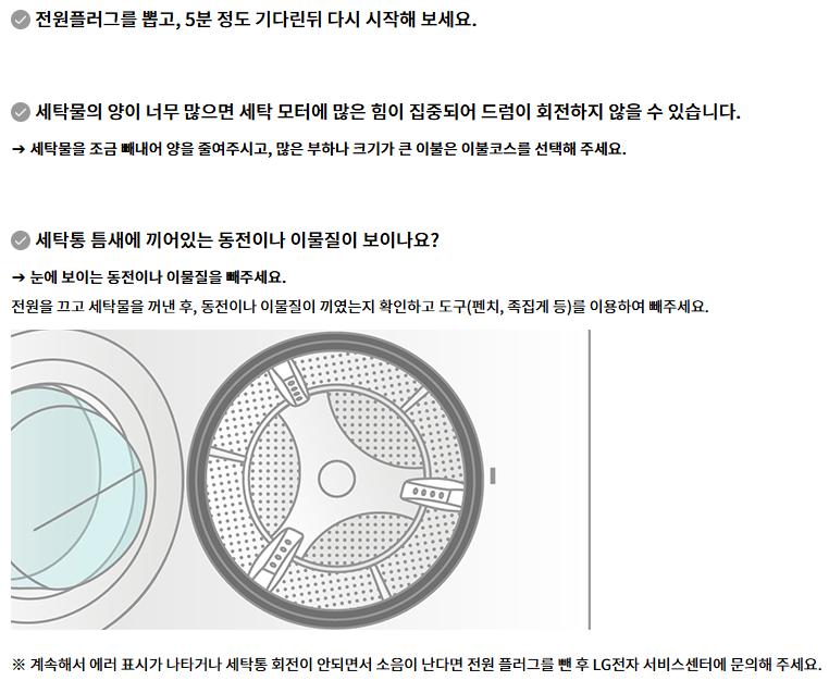 - 손으로 드럼을 가볍게 돌려보아 뻑뻑하거나 이물질이 끼어있는지 확인
