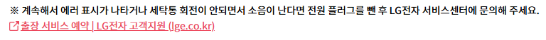 | 임시 조치 | 전원 리셋, 세탁물 제거, 드럼 확인 |
