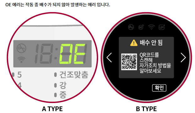 A. OE는 "Outlet Error"의 약자로, 세탁기 내부의 물이 제대로 배수되지 않을 때 표시됩니다.