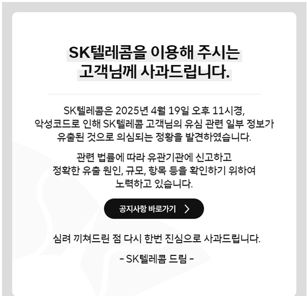 2024년 말~2025년 초 사이, SKT 이용자 일부의 개인정보가 외부 해킹으로 유출된 사실이 드러났습니다. 이 중 다수는 이름, 생년월일, 통신사 정보가 도용되어 알뜰폰 개통 및 eSIM 악용으로 이어진 사례도 있습니다.